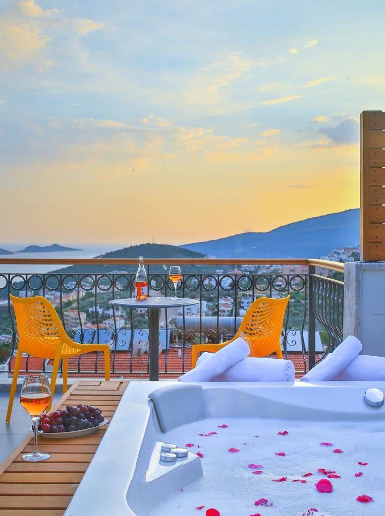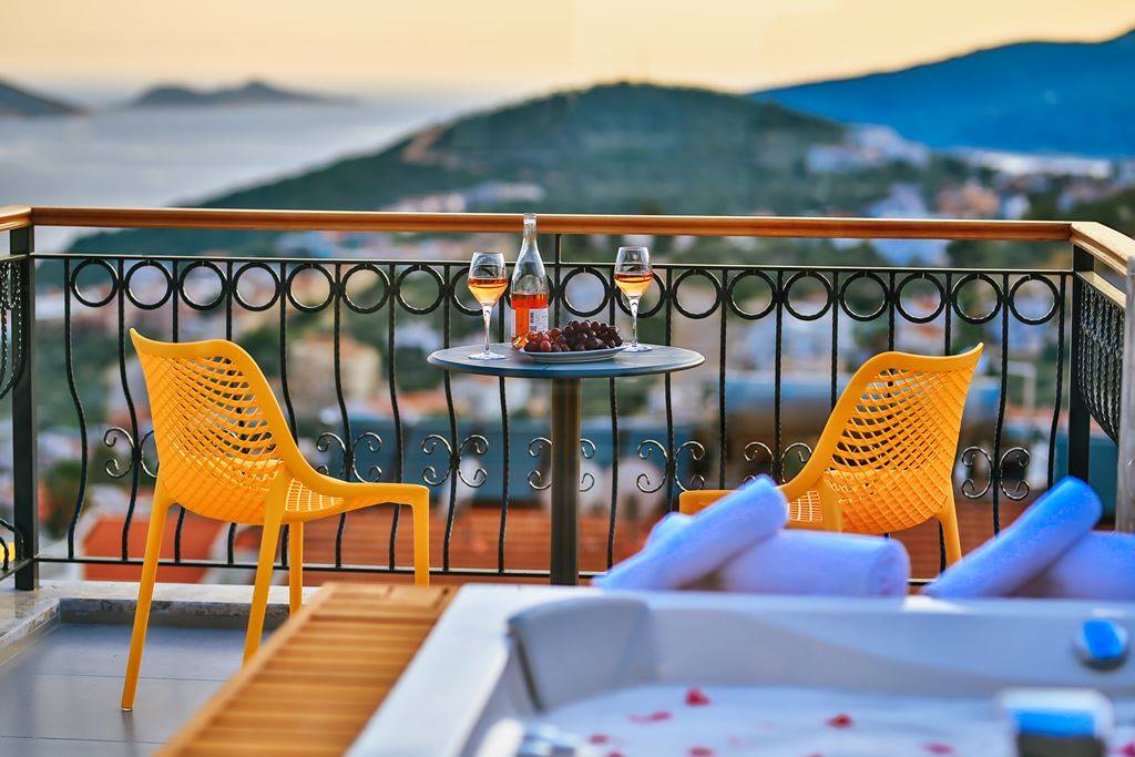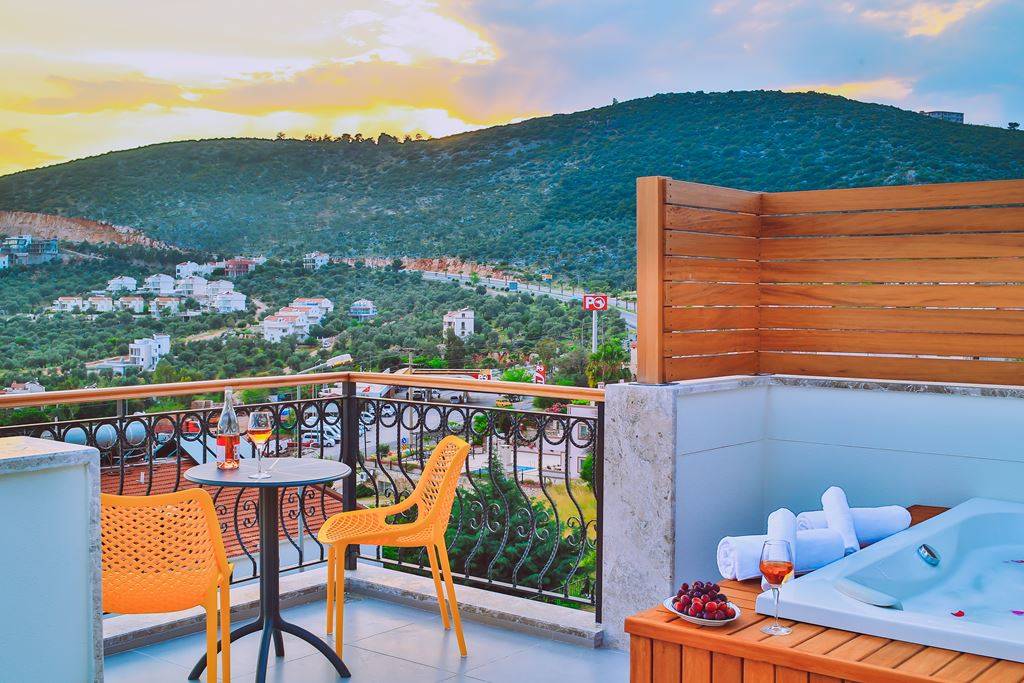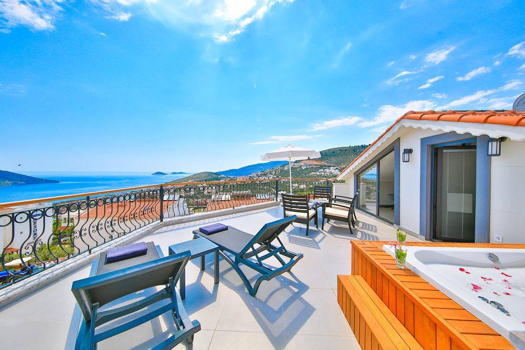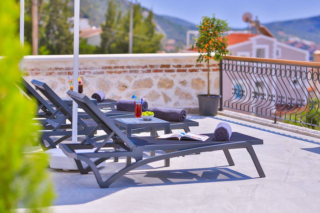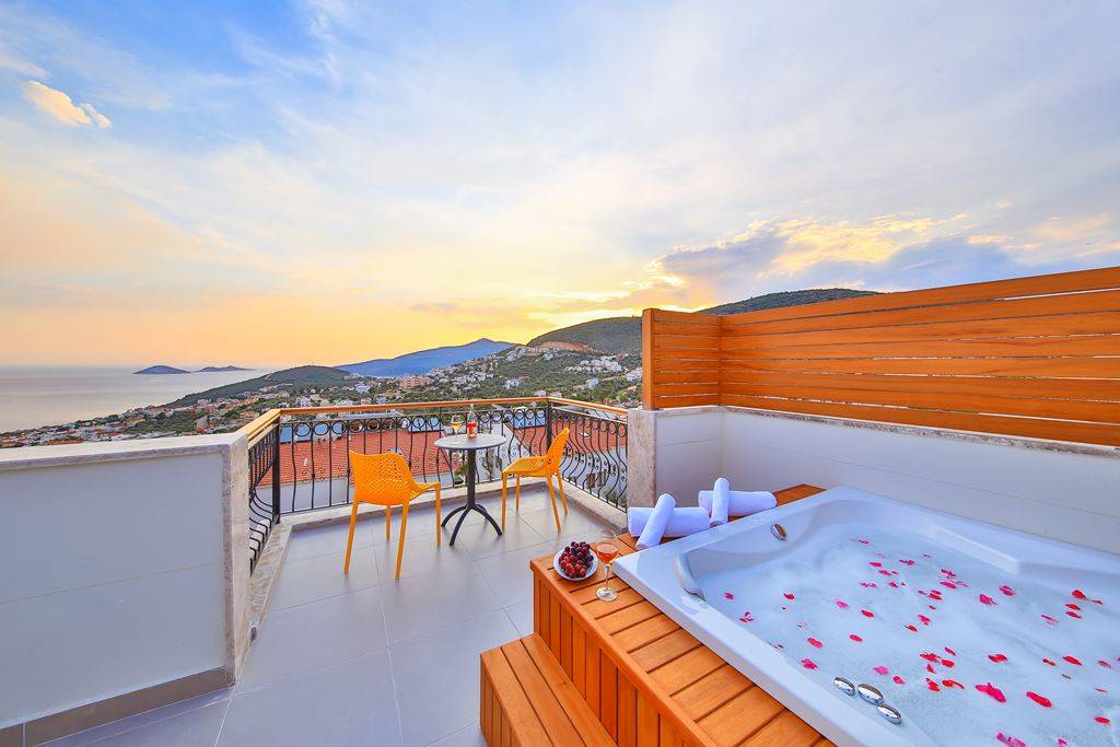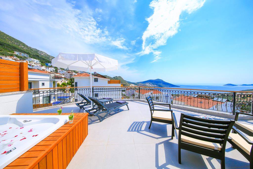 Roof Terrace: Panoramic view of Kalkan, Sea and Nature, Jacuzzi, Chair, Umbrella, Deck chair and sitting group are available.