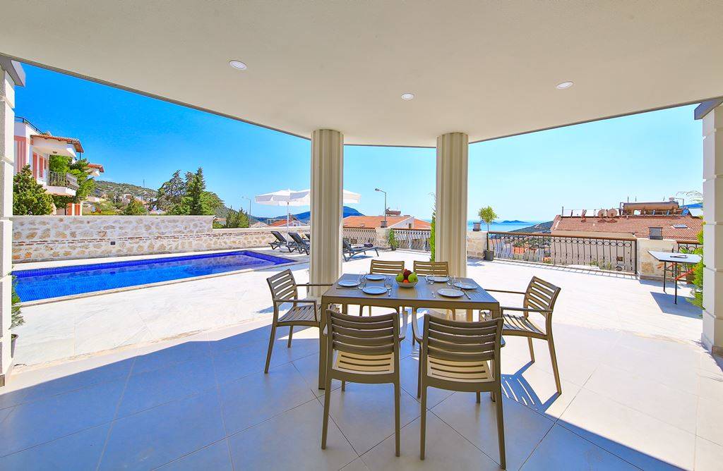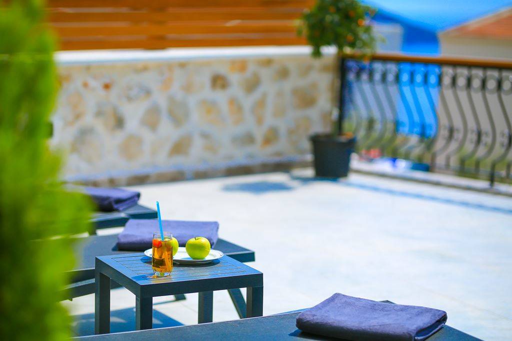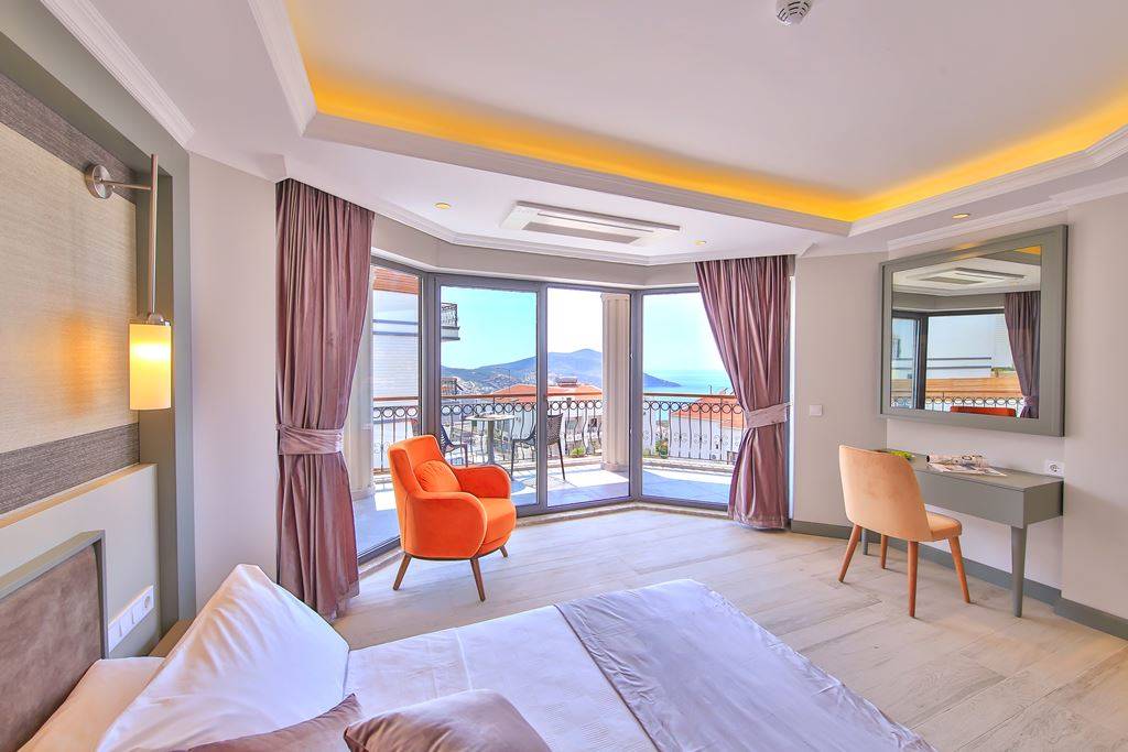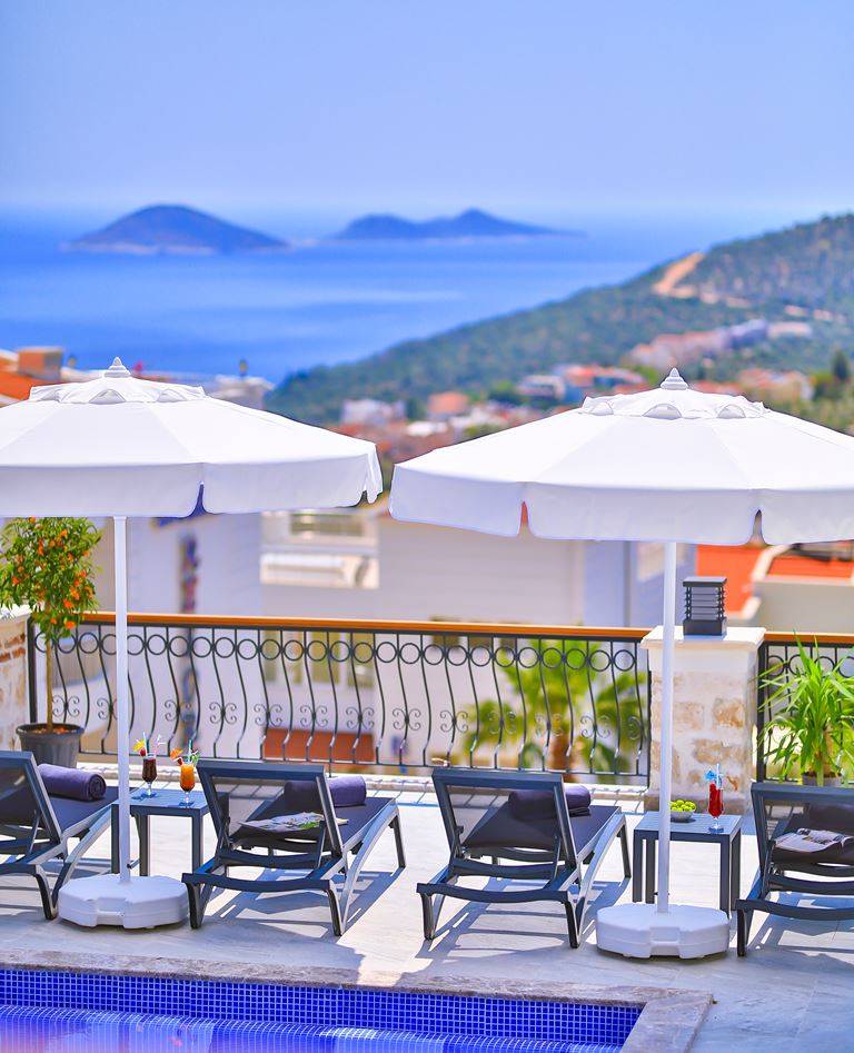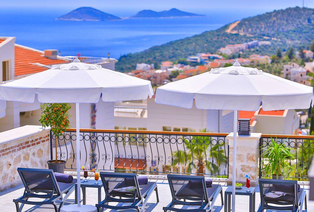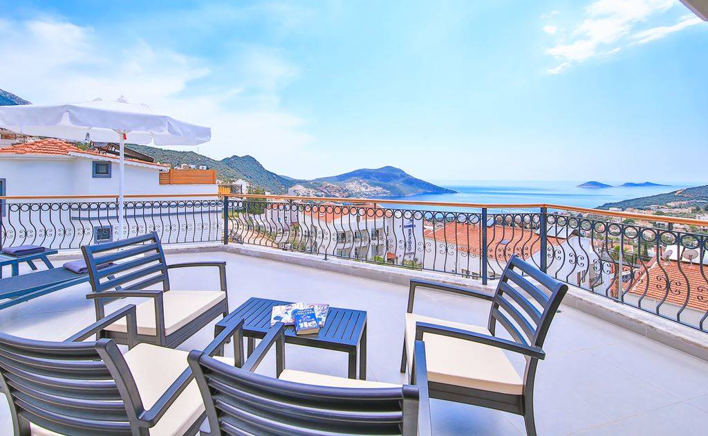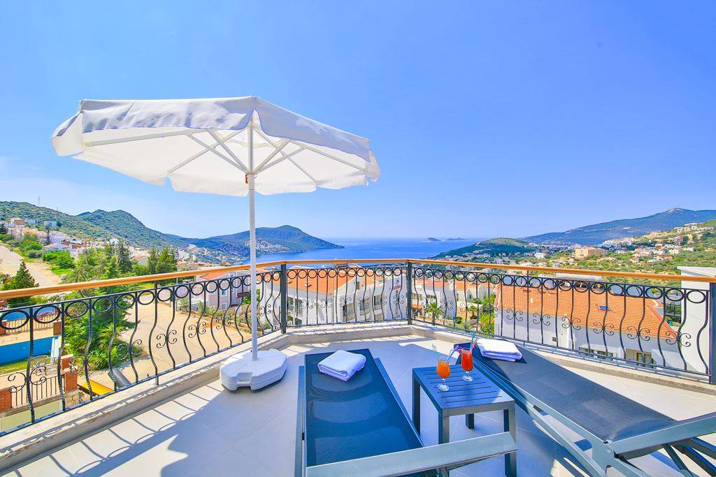 Roof Terrace: Panoramic view of Kalkan, Sea and Nature, Jacuzzi, Chair, Umbrella, Deck chair and sitting group are available.