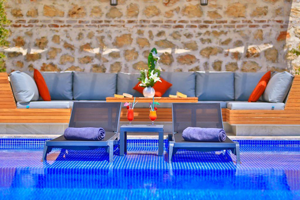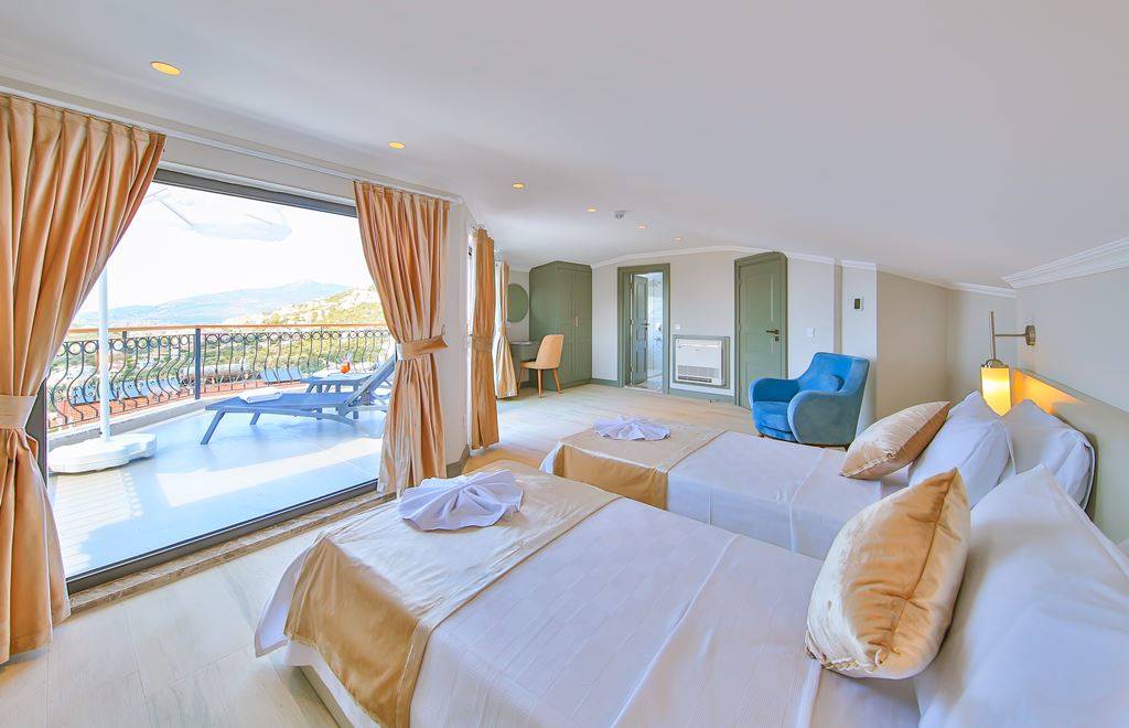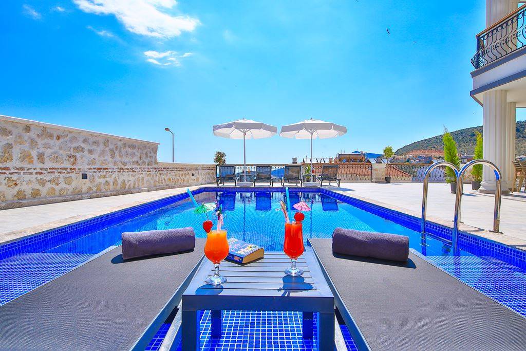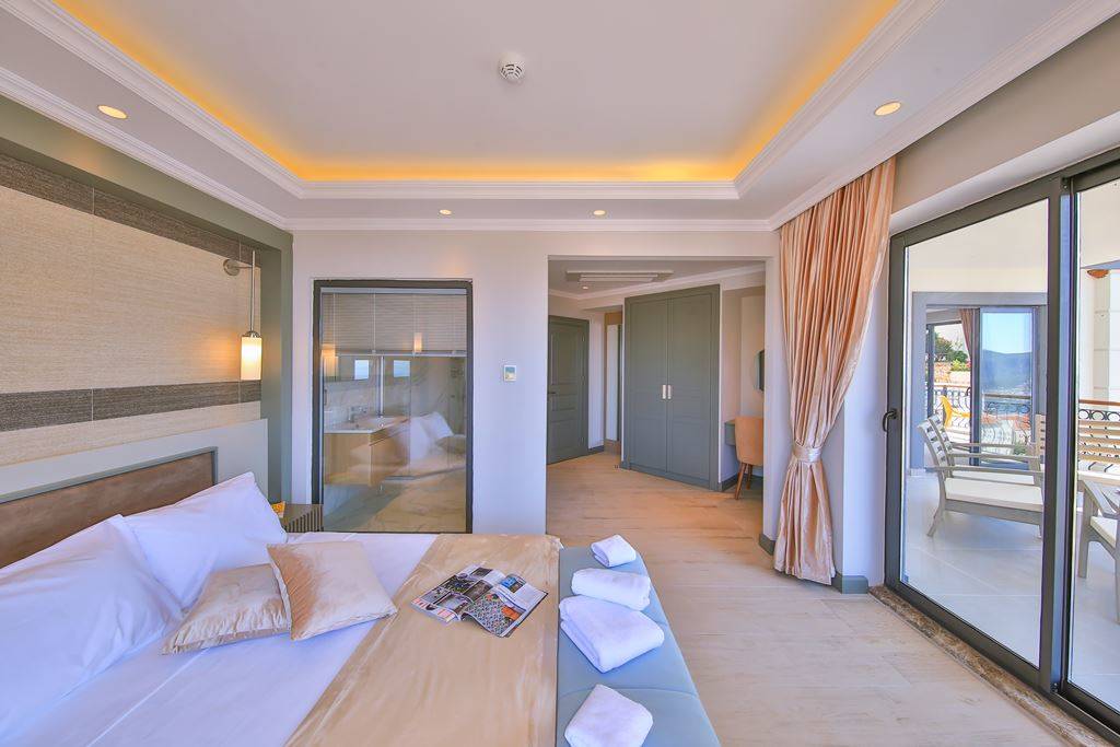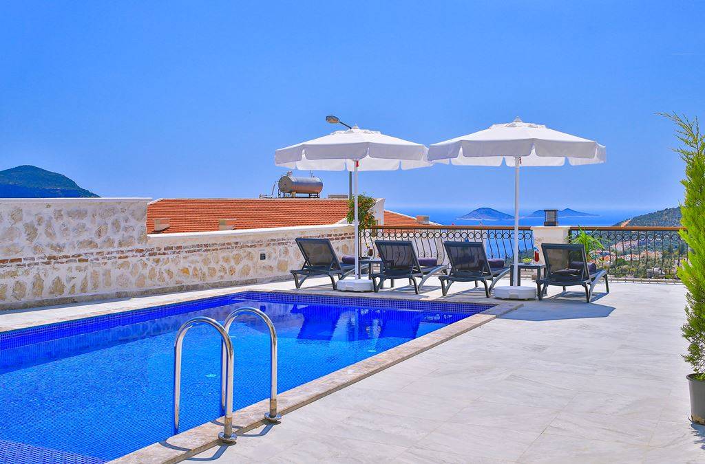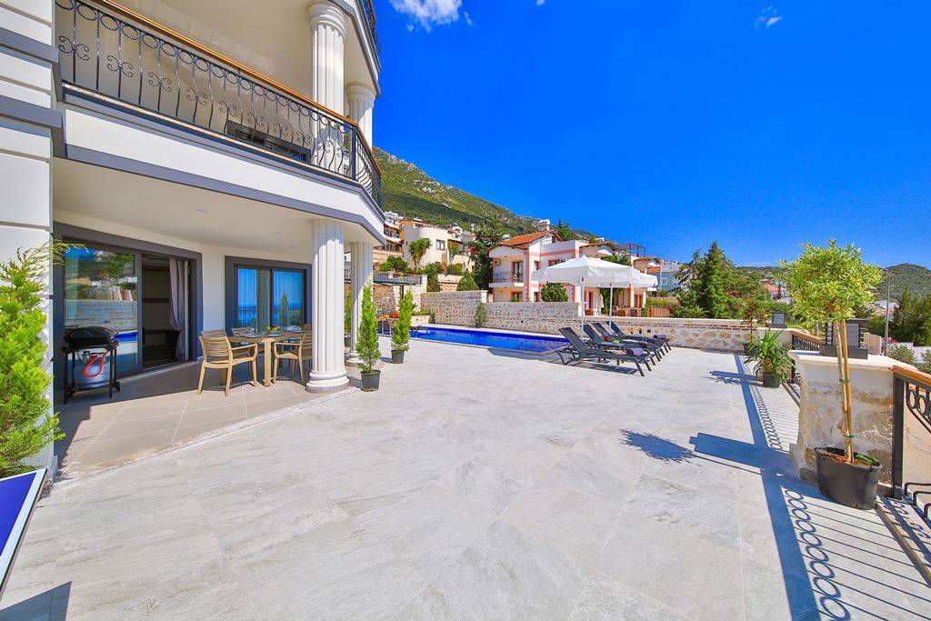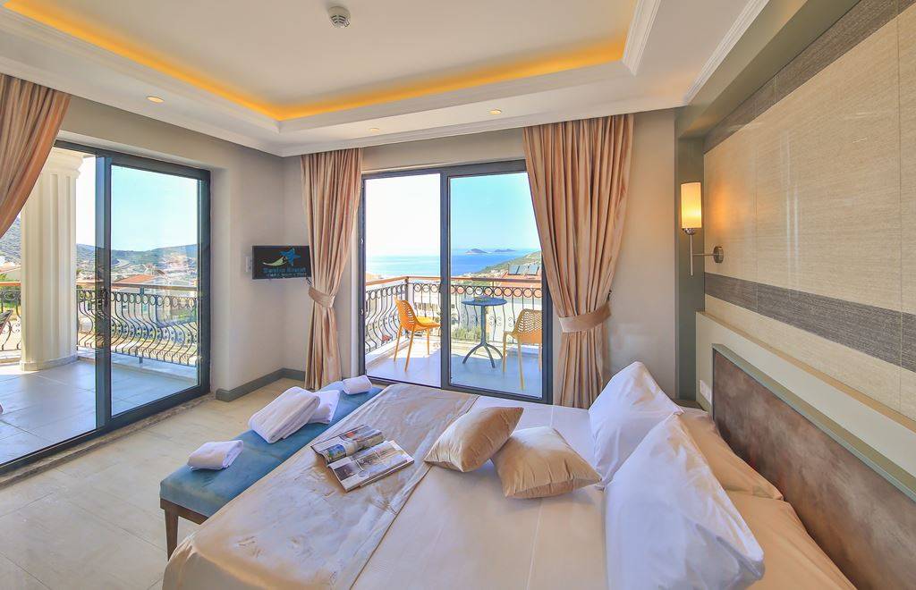 Roof Terrace: Panoramic view of Kalkan, Sea and Nature, Jacuzzi, Chair, Umbrella, Deck chair and sitting group are available.
