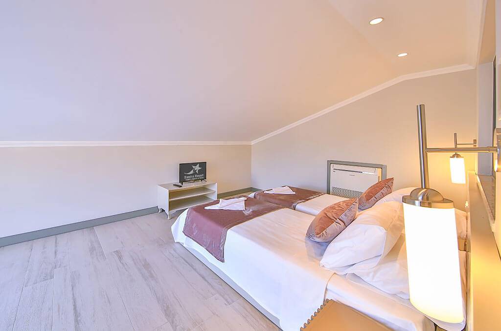 Details: There are 2 single beds, a dresser, a nightstand, air conditioning, a bathroom and a balcony.